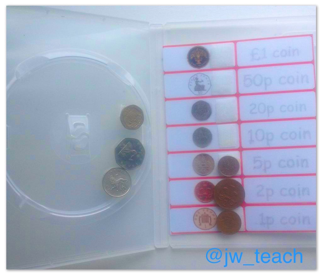 Similar idea but with coin identification. The coins are attached with Velcro to the inside of the DVD case and matched to the sheet on the other side. The child can then overwrite the names. Real coins are best to use here. And of course you can adapt the task as the child develops their skills by just replacing the sheet with a more challenging one.